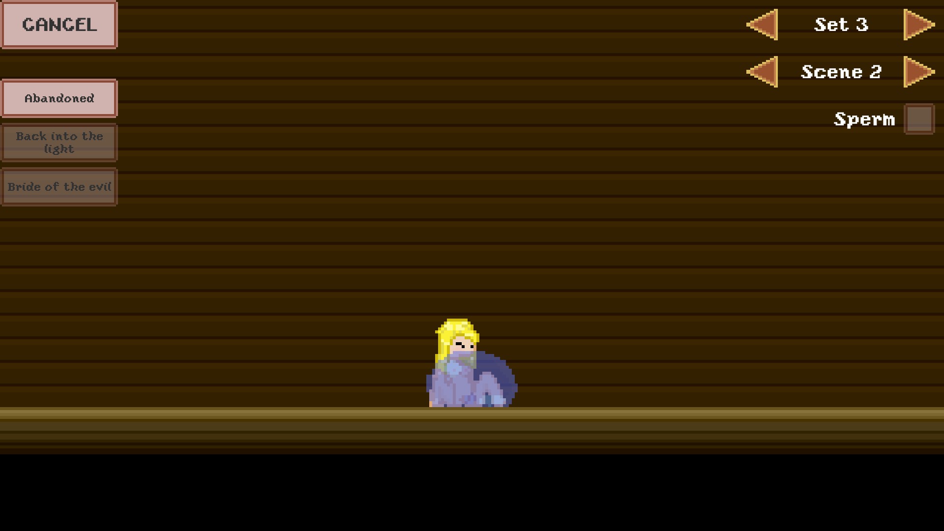 The titlemenu looked great! It was stylistically consistent, rendered with simple-colored pixel art. I would have liked to have seen some sort of animation for the title, but it’s good as-is. What’s not good are the available selections. You can adjust language preferences, but not audio or display from the titlescreen. I’ll say it again — having to mute a game via external software is BS. “Extra” functions are a gallery, allowing you to place the protagonist in your choice of enviroment and sexual scene (that you have previously encountered).